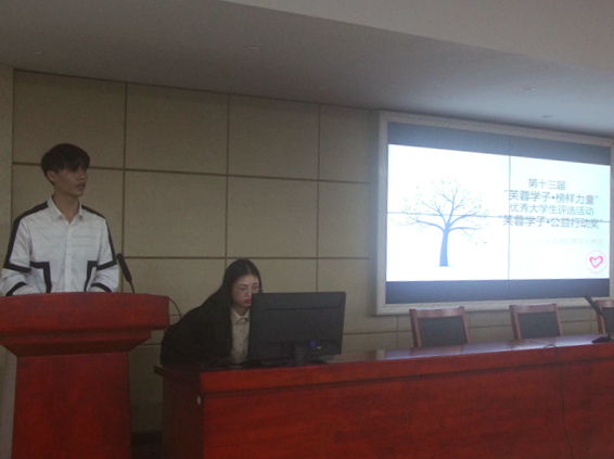 为使同学们对“芙蓉学子”项目有更深入的了解,科技部李东萦介绍了该项活动具体内容。“芙蓉学子计划”旨在通过挖掘、宣传在校大学生积极进取、拼搏奋进的感人事迹和先进典型。在当代大学生中树立自强自立的榜样,激励广大青年学生向身边的榜样学习。活动设置五个奖项,我院青年志愿团入选为“芙蓉学子·公益行动奖”,吴玉容同学入围“芙蓉学子·自强不息奖”。今年是我院申请“芙蓉学子”项目的第一年,希望通过宣讲形式增强项目影响,号召各班同学为我院入围学子助力。