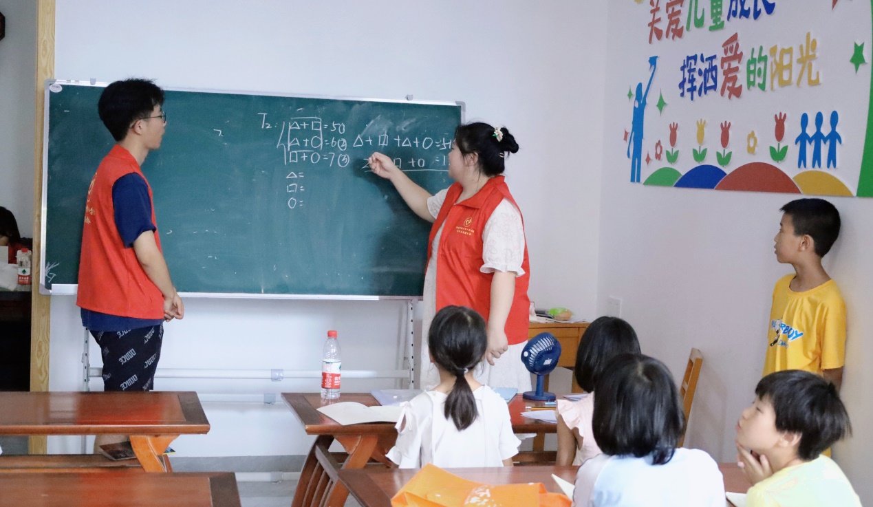 语文课上志愿者正在纠正了学生的落笔顺序,志愿者说道:“写字的时候,上宽下窄才好看,俗话说‘人如其字,练好字很重要’”,逐字逐句教授学生正确的书写顺序,一笔一划之间既是传授知识,也是育人。五年级数学课堂上正在教授分数的乘法,志愿者循循善诱、娓娓道来,学生积极举手,敢于上讲台进行板演。