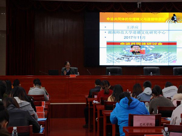 11月19日,湖南省第十届研究生创新论坛“人文学术创新与文化传承”分论坛主题报告(二)在我校立德楼A附楼五楼报告厅举行。湖南师范大学王泽应教授应邀来我校做了题为“人类命运共同体的构建及伦理意蕴”的学术讲座。讲座由我院党委书记廖加林教授主持,副院长毛小平博士及省内高校研究生代表到场聆听。