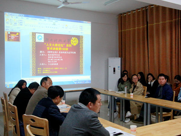 4月14日晚上,国家图书馆研究员张延银研究员应邀于立言楼B523室主讲了以《<昭明文选>如何成为文学经典》为题的学术讲座。我院徐前师、李德辉、张晚林、聂志军、李鸿渊等老师及部分研究生到场聆听,讲座由王友胜教授主持。