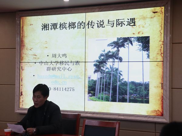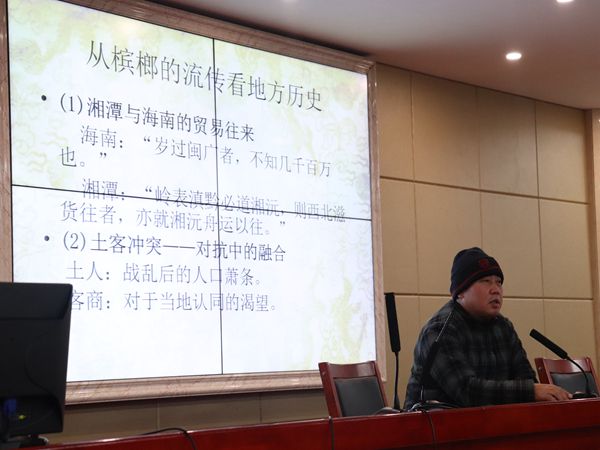12月9日下午,教育部长江学者特聘教授、中山大学社会学与人类学学院周大鸣教授应邀于立言楼B4-1开展以“湘潭槟榔的传说与际遇”为题的学术讲座。我院李胜清教授担任主持人,廖君湘教授、罗渊教授、潘年英教授、胡铁强副教授、胡志明博士以及文艺学研究生代表和部分18级汉语言文学专业同学到场聆听。