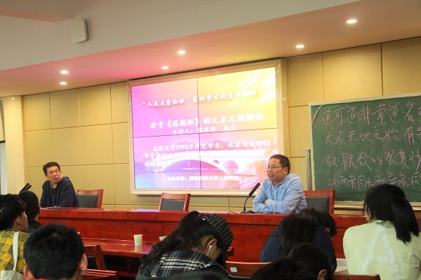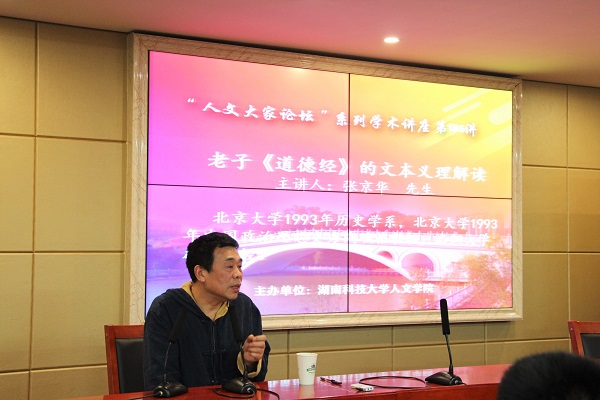 4月17日晚,湖南科技学院张京华教授应邀前来我校中欧电竞游戏官网做了一堂题为“老子《道德经》的文本义理解读”的精彩学术报告。本次讲座由我院党委书记廖加林教授主持,我院吴广平教授、王友胜教授、张晚林教授、颜中军、胡忆红、余霞、胡红梅、龚超等老师及文、史、哲等专业的100多为本科生、硕士研究生到场聆听。