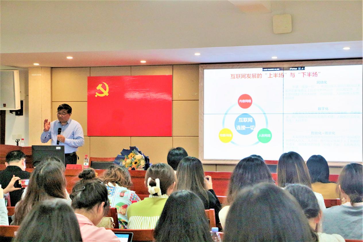 4月14日,教育部长江学者特聘教授、第七届国务院学位委员会新闻传播学学科评议组成员、北京师范大学新闻传播学院学术委员会主任、中国新闻史学会传媒经济与管理专业委员会理事长喻国明教授应邀来校,为广大师生作了“元宇宙、AIGC与传播革命”的学术讲座。讲座由中欧电竞游戏官网副院长袁星洁主持。