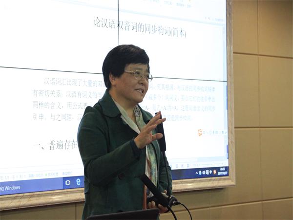 “我今天为什么站着讲呢?因为刚吃了晚饭,‘腹犹果然’。”王教授一开口,就以幽默的话语,活跃了现场气氛,吸引了全场听众。她从“果”字入手讲解了词的核心义与引申义,“‘果’原义是‘果实’,而多数果实的特征是圆润饱满,因此‘腹犹果然’。”王教授以“点”、“翘”、“奋”、“幅”与“副”、“只”与“双”等常用词为例,形象深刻地剖析了汉语词汇从核心义到其他意义的演变,用简单、生动的例子向大家展示汉语规律性。王教授说“一个字、一个词,就是一幅画,一首歌,语言文字其实是趣味横生的。”王教授的讲座就如王教授所说的语言文字一样,生动有趣、充满激情。